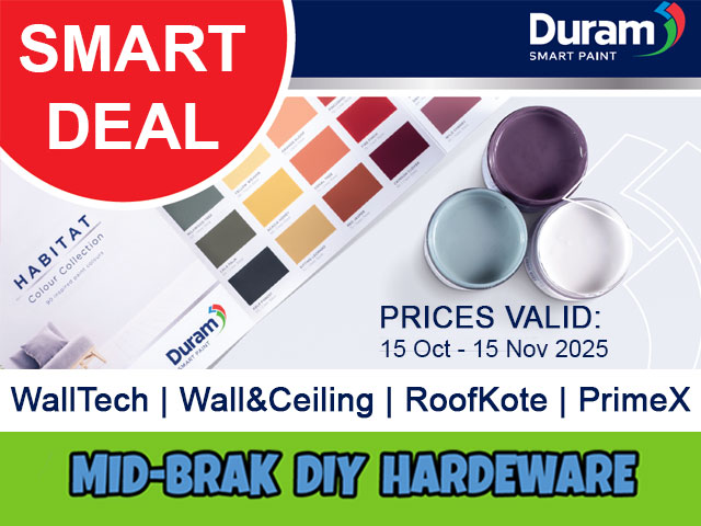 Midbrak DIY Hardware is your reliable supplier of Duram paint, ideal for renovating interior spaces or enhancing the exterior of your home with a fresh, professional finish. Whether you’re undertaking minor improvements or a large-scale project, they offer the right paint solutions to meet your needs. The Smart Deal is valid from 15 Oct till 15 Nov 2025 – don’t miss out on awesome discounts on selected Duram paints!